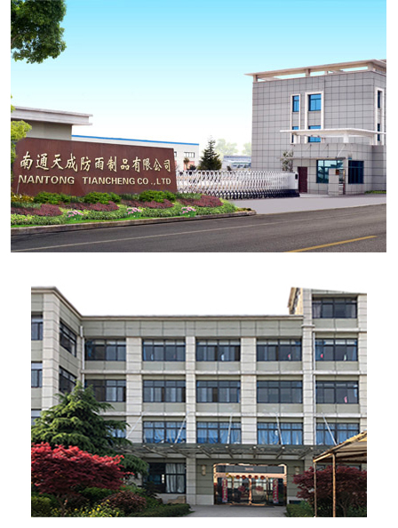 南通天成防雨制品有限公司是一家生产各种防雨制品的专业企业,公司创建于一九九六年。公司自创办十几年来,持续发展壮大,现有厂房面积一万多平方米,主要生产设备从德国、日本进口。现有公司员工二百多人,日产量二千(套)件。南通天成防雨制品有限公司位于江苏如皋天成工业园惠业路8号紧邻沿海高速、二零四国道,距南通机场、如皋机场、南通、如皋火车站、如皋港均不超过一小时车程,交通十分便利。